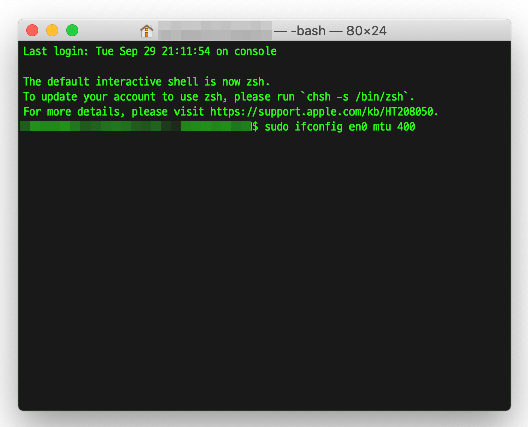 터미널을 실행시키시고 "sudo ifconfig en0 mtu 400" 이라고 입력하시고 엔터를 치시면 되십니다. 그러면 본인 맥의 비밀번호를 입력하라는 부분이 나오고 비밀번호를 입력하면 바로 적용이 되죠. 여기서 하나 살펴봐야 하는게 위의 명령어 중에 en0 라는 부분에서 본인의 인터넷 접속 방법에 따라서 en0 또는 en1 또는 en2 로 바꿔야 할 수도 있습니다.