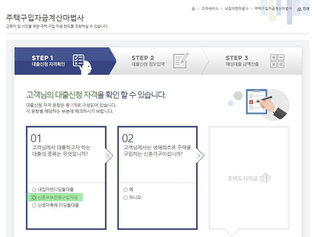 대출 종류: ‘신혼부부전용구입자금’ 선택하시고 생애최초 여부, 소득, 주택가격 등 자격확인을 먼저 합니다.