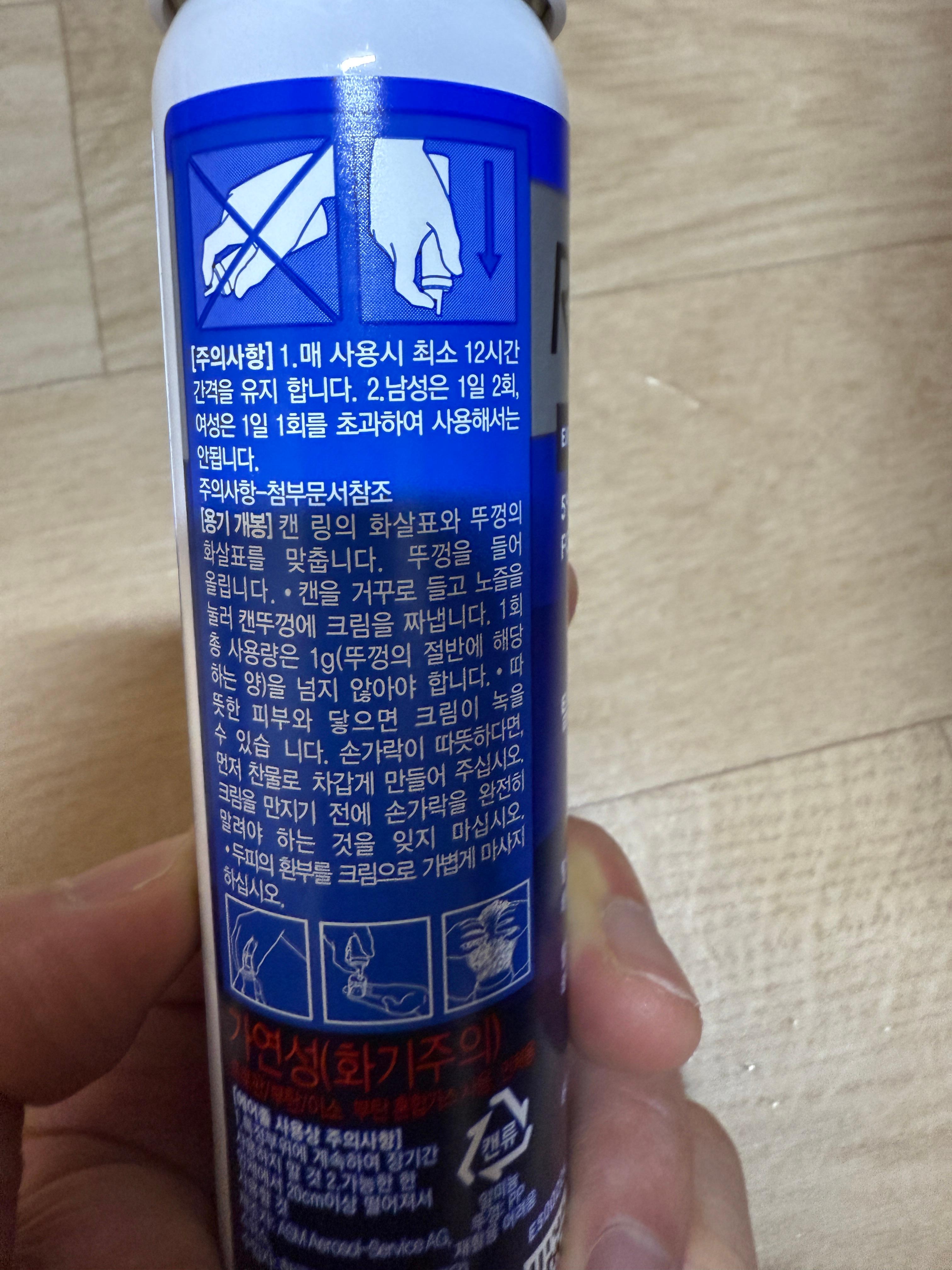 사용법은 남성은 1일 2회, 여성은 1일 1회만 써야 하고, 도포하고 12시간 간격을 유지하라고 하네요. 머리를 완전히 말리고 나서 뚜껑이 있는데 거기에 절반정도만 짜서 환부에만 도포하면 됩니다. 그냥 손으로 쓱쓱 문지르면 됩니다. 다 문지르고 다면 꼭 손을 씻으시고요.